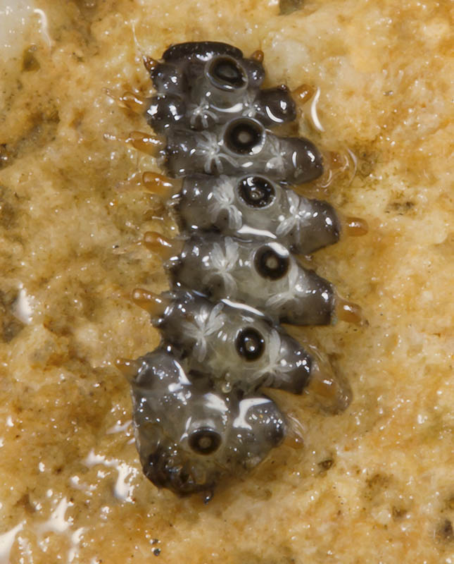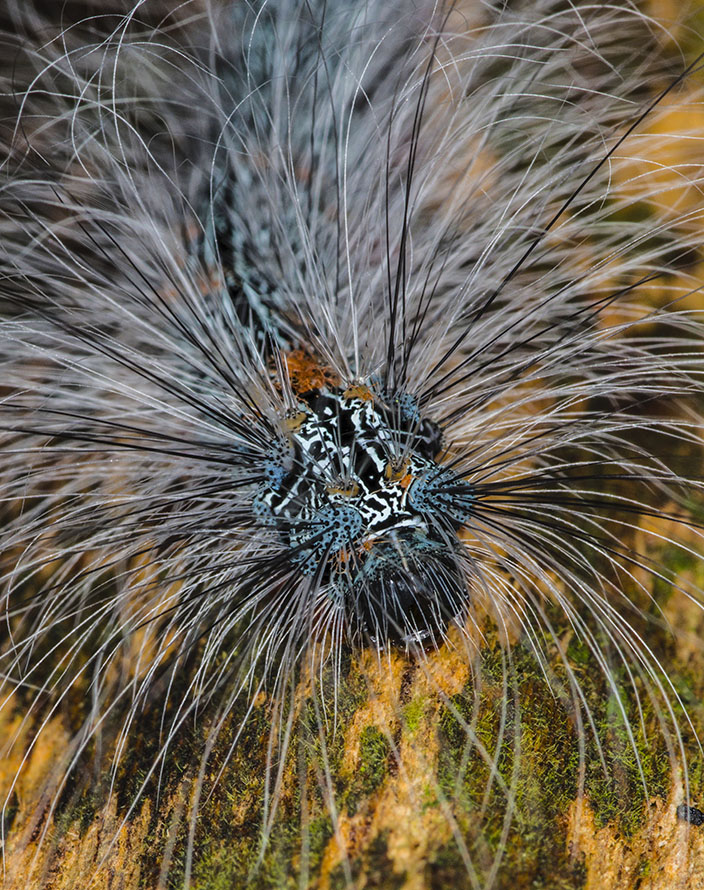 The extra tufts, above, are very fetching, yes, and allow more colour combinations. Below are two hairies from Borneo. What is sweet is the impression they are staring at you with those cute, intense blue ‘eyes’. These are actually just sensory hair tuft mounting points, and the real eyes are just tiny black spots lower down, and very hard to find.