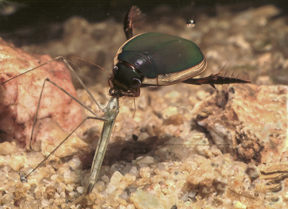 Dod-eat-dog is well defined by the grizzly situation above. A hungry diving beetle has chosen a prey, which itself is a fearsome hunter. A water scorpion. Like all beetles, it has proper, sideways acting, chewing jaws, with which it can scrunch and chew all of the catch.