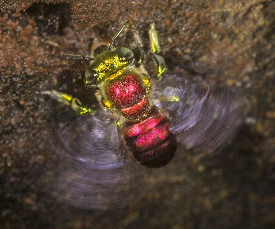 So these bees are really really fab. And sadly most humans do not know they exist, and will never see them, because even here in the hot bed of all things nice, they never stop, and very rarely come down from the very high rainforest canopy. I was lucky enough to be here with my old frined Mr Bee, a German bee scientist/fanatic, who understands the way orchid bees think. The boy bees – most of whats dispalyed here, spend their time looking for new and exptic scents. Note the blue bee below, and see a little arrow pointing to its back leg. This extra fat ‘thigh’, femur, has an opening on top to a reservoir where they add the collected smells. Each individual boy bee is a master perfumer, creating never before odours with which they will court the very particular girl bees, up in the canopy.