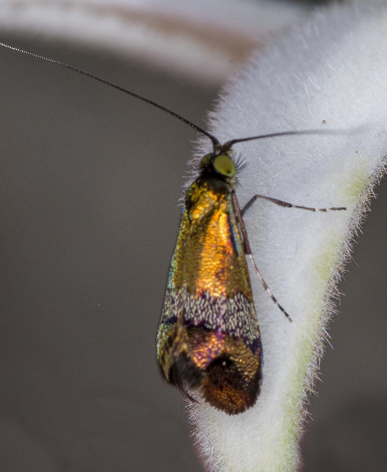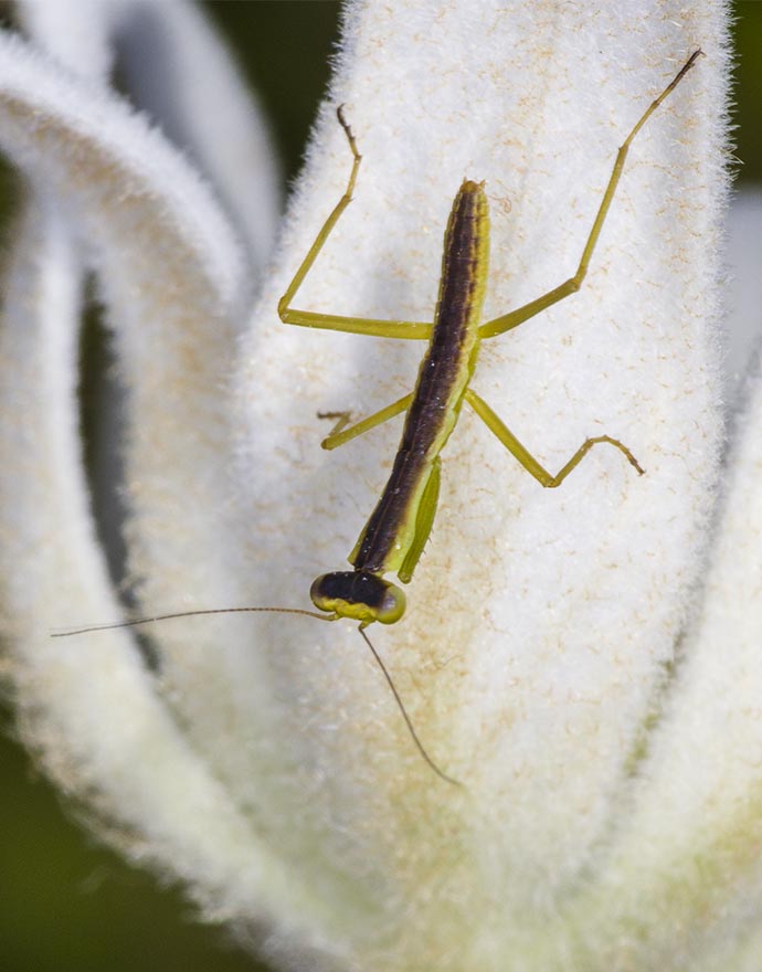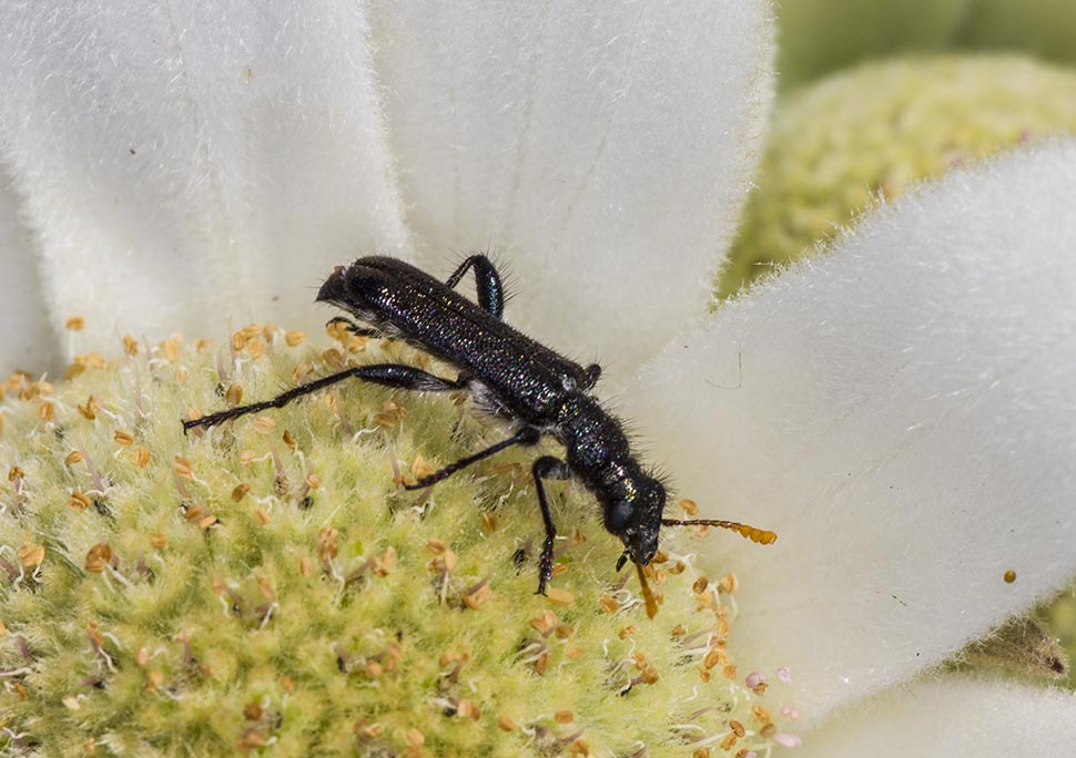 1 = Tiny moth in the fun Adelidae Family. 2 = a tiny chafer beetle, genus Diphucephala, which has infinite variety of metallic shades. 3 = a beetle of the Cleridae Family having a munch. 4 = a bee fly, feeding between hovering about and laying eggs in the sand nearby. 5 = a crab spider, slurping up a poor bug that landed at the wrong flower at the wrong time… 6 = baby mantis on the hunt 7 = an ant – NOT, but a longicorn beetle mimicking one of the golden-bum ants. Clever indeed.
