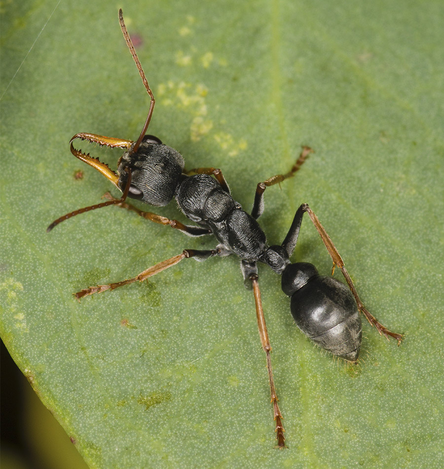 Let me tell you the Odontomachus story. These weird horizontally stretched-out jaws, have been ratcheted back from the closed position, by the use of special muscles with extreme elastic properties. The force the ratchet is holding back is so large, that when the ratchet is released, they snap shut in 1/20,000th of a second ! The ant is only 20mm long, and not in the hand, but the snap can be clearly heard as a micro sonic boom of sorts. And the object it snaps on, is not so much squished, as vibrated to death instantaeniously. The innards of the bull ant, inside its tough exoskeleton, are discombobulated, shaken and stirred, and demise is instant. And here, below, another lovely coloured species of snap-jaw ant, from Papua New Guinea.