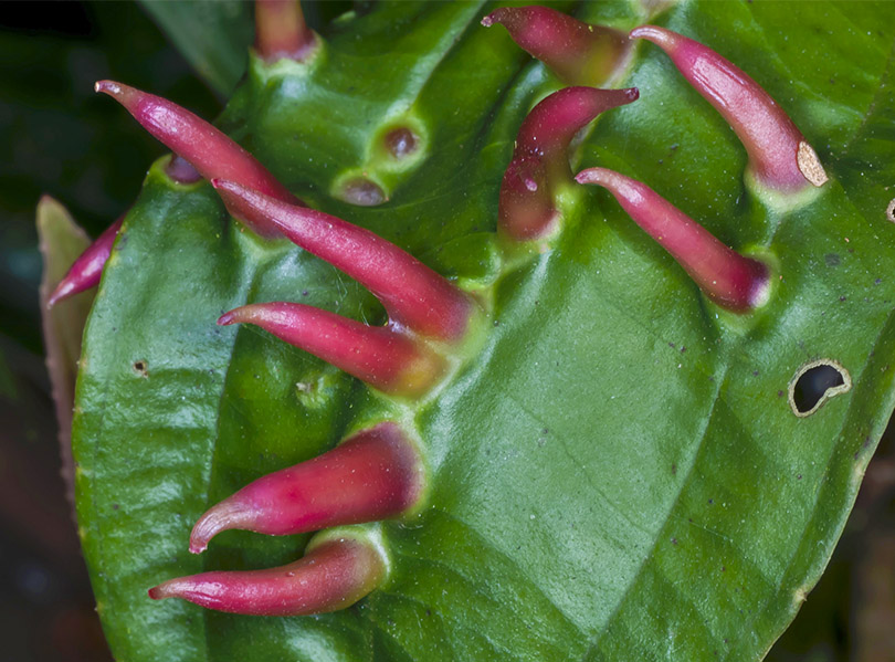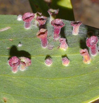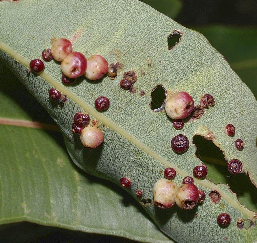 There has to be someone out there eating leaves or we would be strangled in our sleep by voracious plants with nowhere left to expand to. Caterpillars on the whole eat more leaves than big vegetarian animals (they expand, literally, a thousand-fold in a short life of hoovering in nice green leaves). And termites eat more grasses and dead vegetation than the herds of gnus too. And then there are the ones that vause plants to make little homes for their babies. Weird growths on leaves that safely house larvae of many species of flies, bugs wasps and more. These are known as galls. Below left is caused by a sap sucking bug, the apple-like ones, and the far-out red ones, are a mystery to this observer. What is amazing is that these things are genetic engineering on the fly. The insects inject chemicals which essentially cause the leaf to madly reproduce cells in that area. Not too different from cancer, except that these growths have a particualr shape and size – they do stop growing when the egg inside has a nice enough/large enough home to live in.
