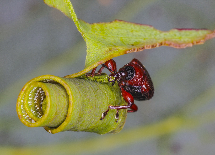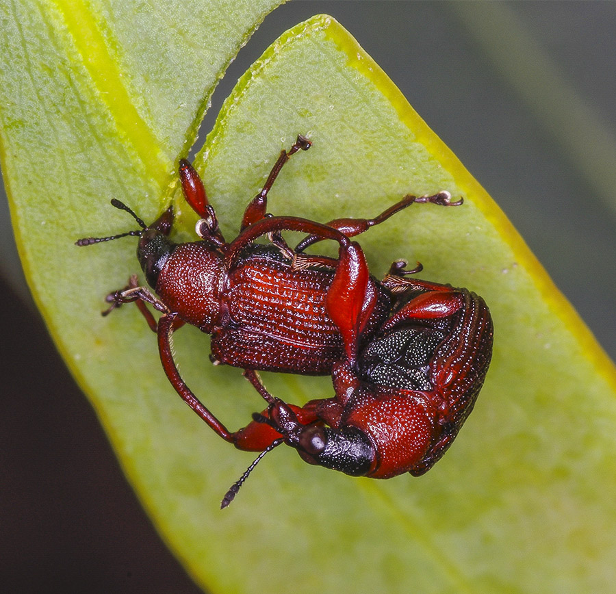 But I digress. This was going to be a blog about leaf cutters, not leaf genetic invaders. Caterpillars and grasshoppers have very sharp mandibles – their sideways acting jaws. They can and do cut strips off leaves all day every day, and not blunt these tools. And of course they eat the stuff directly. What about insects that cut leaves to achieve a more complex outcome. Lets start with leaf rollers – cute weevils in the Family Attelabidae. The boy has the wonderful long front legs. He is happy as he has found a female on a leaf and she is about to cut it in a very particular, seamestress style. Before she gets too far, it was time for a bit of mating ritual, to be sure she would use this leaf to house his progeny.