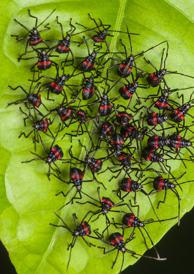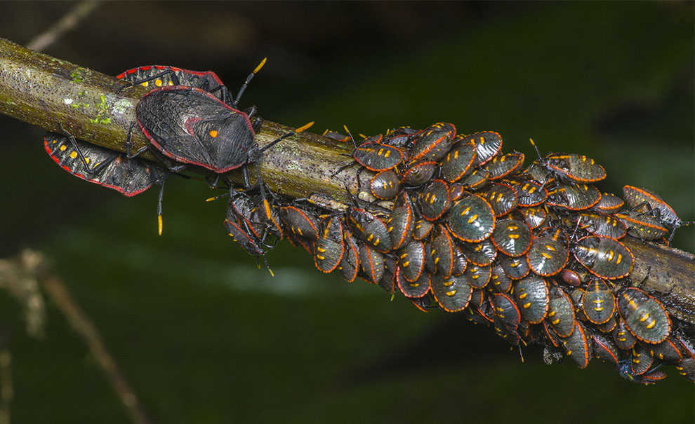 and a family of Pentatomid bugs, 3 mothers guarding their many babies