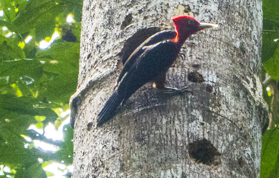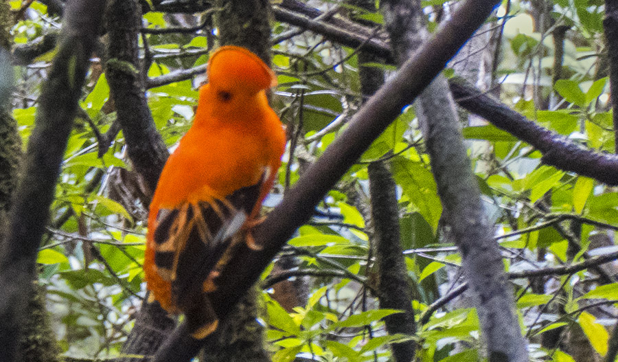 DAY 3 – Next day started with the pea-souper fog to end all fogs. All the little planes that deliver tourists here could not come till the arvo. They come on day trips to see the giant waterfall, but also to see an amazing bird that is emblematic of this part of amazonia – the cock-of-the-rock. Guide took me to the area the males gather and ‘lek’ – show off their stuff. Here a not so good pic from long way off…
