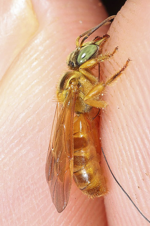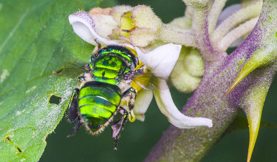 and on the edge of the forest, where a few flowers live, see the fab orchid bee male. These are the fabled bees which collect various and odd scents, mix them in special pouches, and then present them to the females for inspection and jigijigi permission.