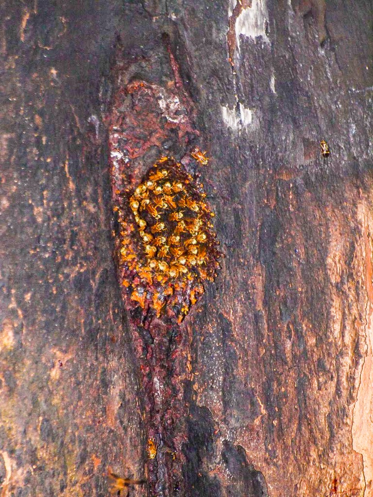 but deep in this Amazonian jungle dwells a species of a little stingless bee, yes without a sting, but with ferocious jaws and a very bad aggro attitude. Go near one of their tree hole nests and you need to run as armies emerge on intruders. Below see the nest, with a full compliment of nasties milling at the entrance with a gnashing of jaws (taken with a telephoto lens from a decent diastance). And next to it the lovely orange bee, having to be held to take a pic by my friend Bernhard, Mr Bee.