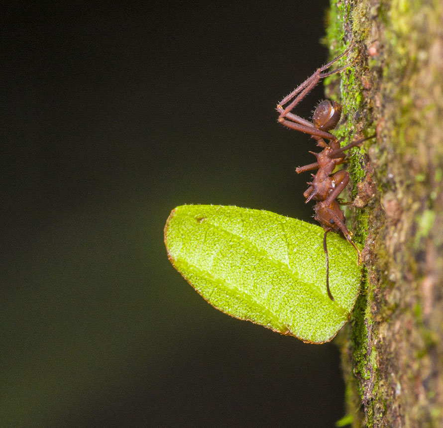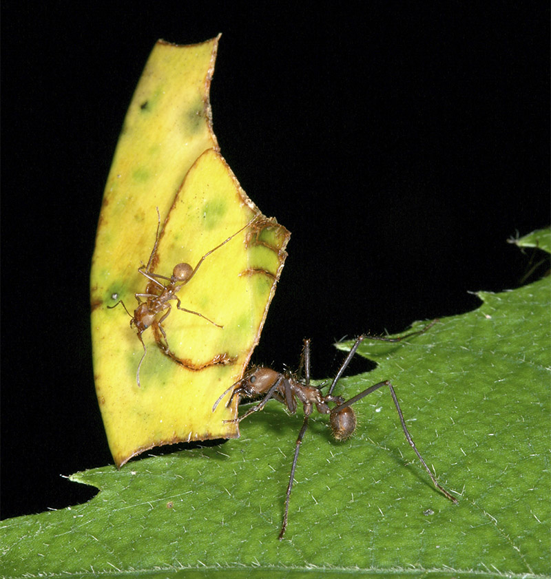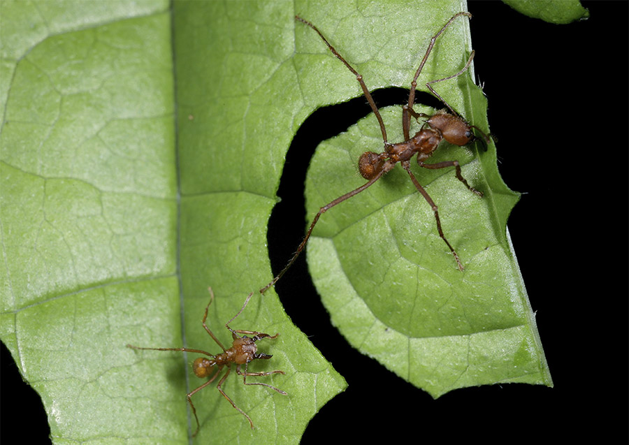 and sometimes even smaller workers ride on the leaf to protect the carrier from parasitic flies that hover near the ant trails.