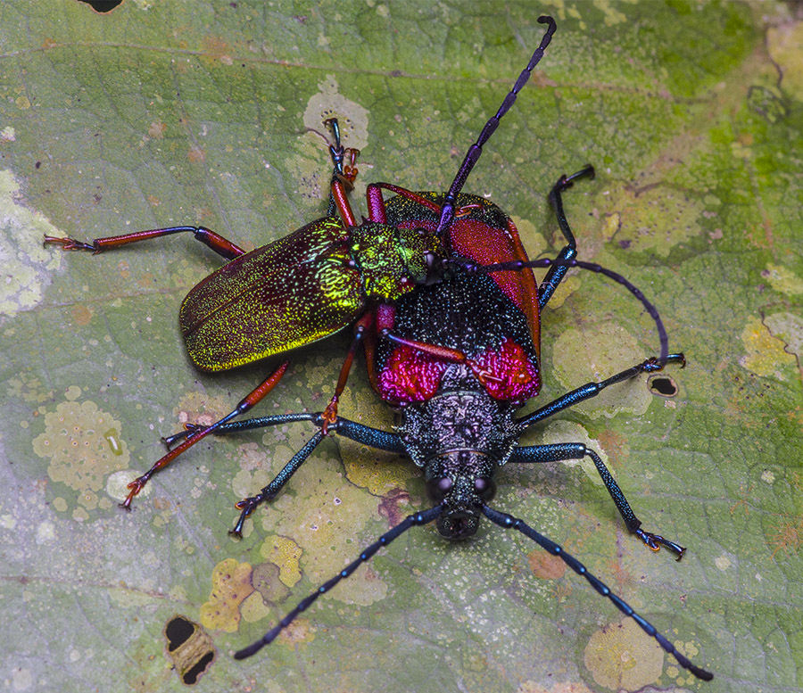 but all this is really leading up to the grand discovery, the reward for spending 6 hours a day in the sauna madness hot jungle, sweating and trudging, searching for insectoids. Every few days a really super schmick creature just happens to be in my path. Here a big female and different coloured small male longicorn beetle