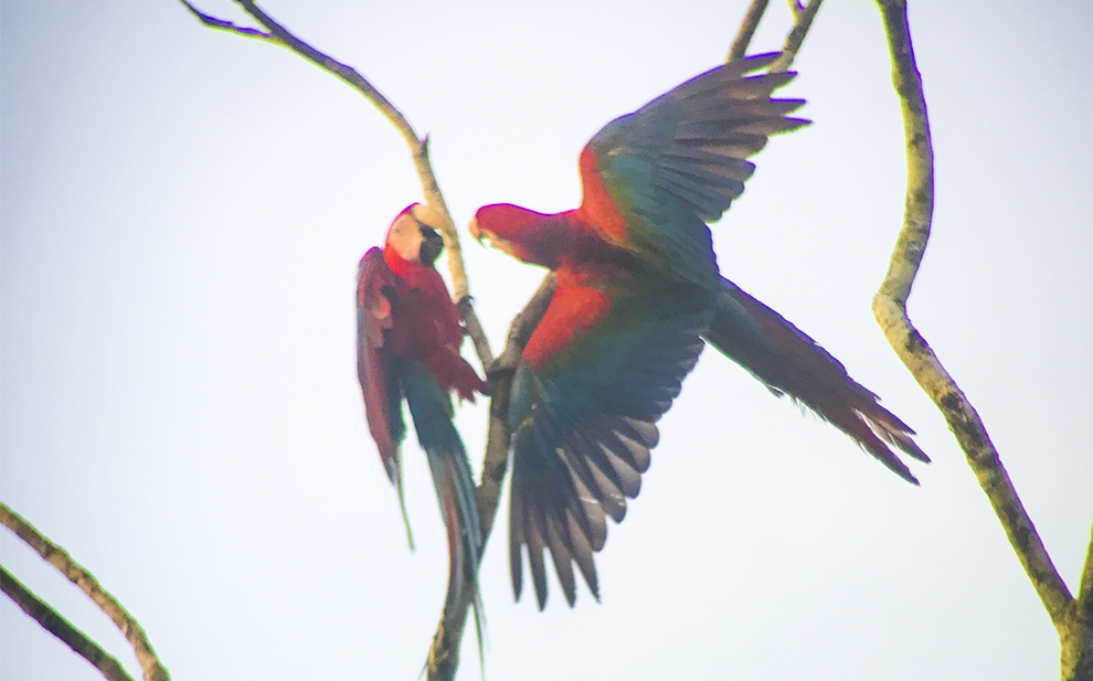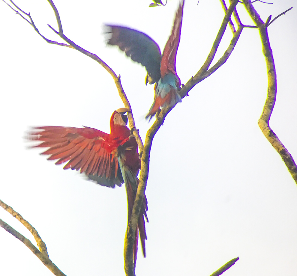 so gird you loins and prepare for a surprise. THE amazonian iconic bird, the very large red and green Macaw, is normally only seen as a pair flying across a bit of sky seen from the forest floor. But today the Very raucous (sulphur crested cockatoos eat you heart out) came to play on a tree in our camp clearing. See my not so perfect pics of the darlings