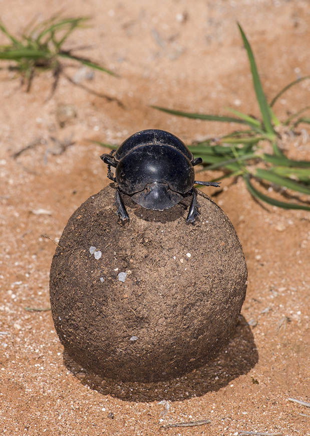 They quickly create the ball which they then push along with their back legs against the dung, and front legs pushing against the ground. Hard work, as the ball weighs many times what the beetle does, and the girl beetle just comes along to watch and chat, and to know where it winds up, so that they can bury it, and she can lay an egg inside. The larva then eats its way out from the middle, pupates inside, and emerges from the hole as an adult. See the helpful girl telling the boy what to do in this short vid I took in the Addo Elephant Park in South Africa…