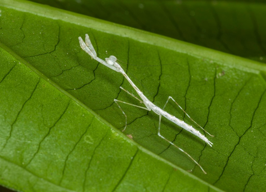 The rarest ‘colour’ among the six legs is white. I have seen a few beetles in the Namib desert, the odd leaf beetles in the tropics, and immature stages of insects which later have real colour as adults. Thus here is a fab pure white skinny praying mantis, hiding under a leaf.