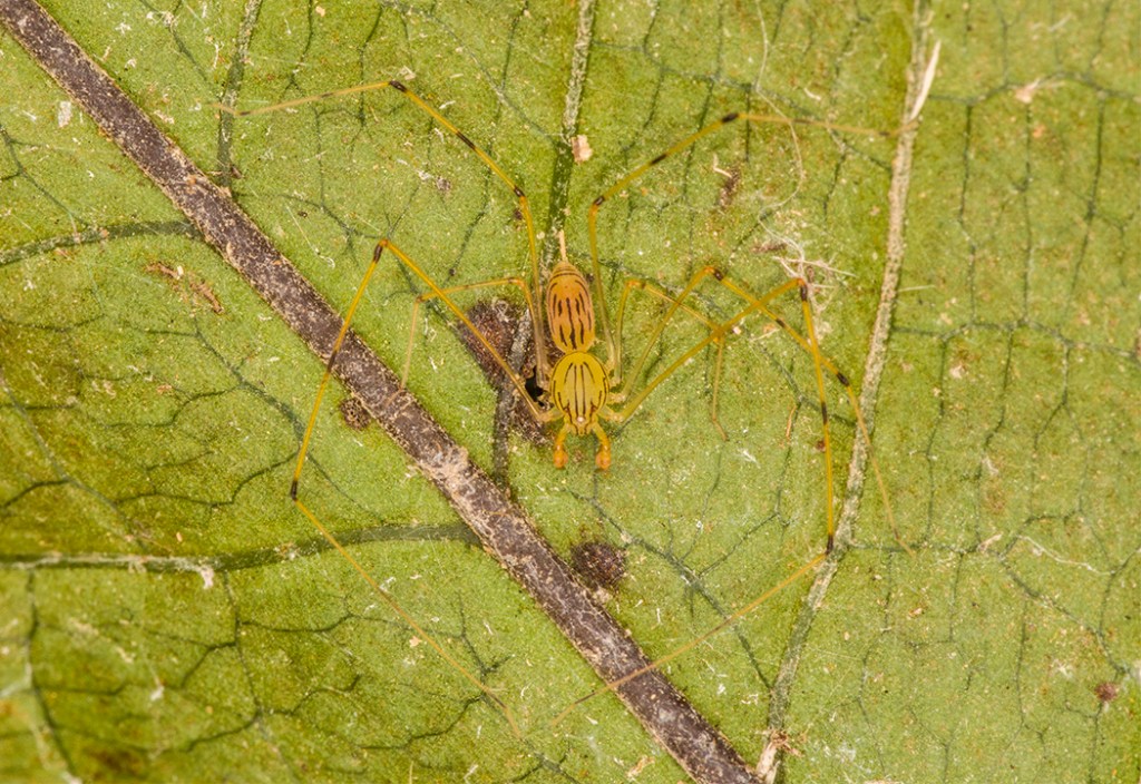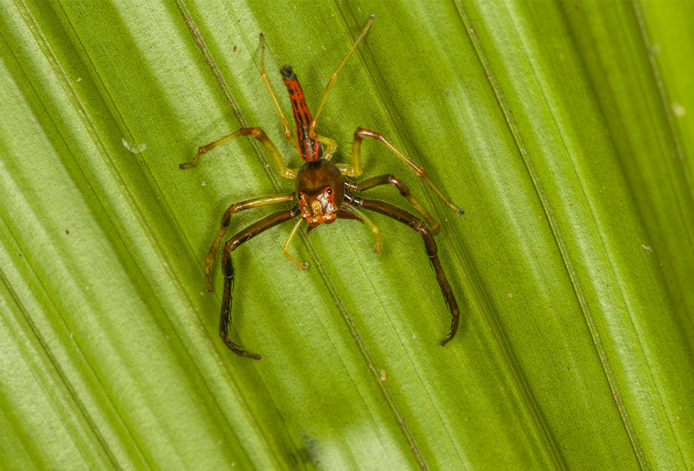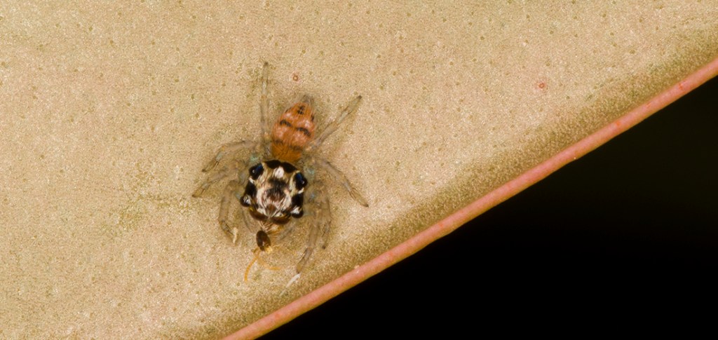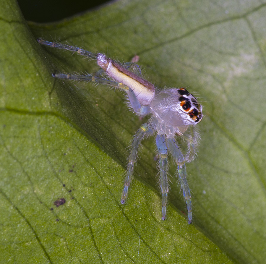 All the above are jumping spiders, Family Salticidae. The tropics have endless species running and jumping around the canopy, and some down in the gloomy forest floor, where humans search for fun six and eight legs. Some are very small, 2mm, (mid left pic), is a common size. But always in close up they are wondrously decorated with fun colours, and the males have elaborate, often long and fluffy palps, which they use to show off to females, and tell males to bugger off.