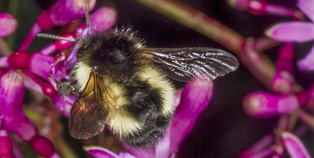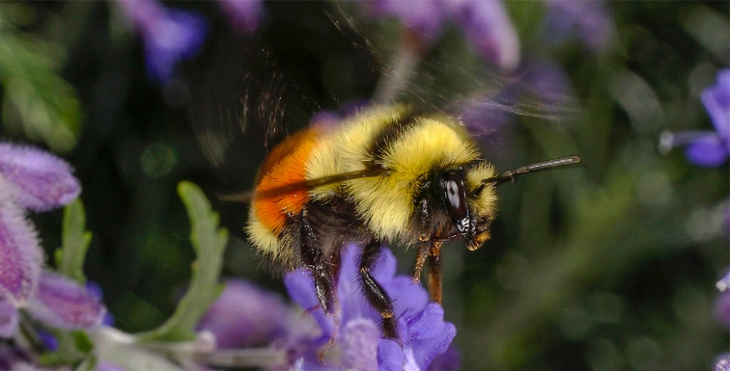The cutipie above is an American species, Bombus (Pyrobombus) silvicola. Note the crazy gossamer patterns of its wingbeats, above – as close as a flash firing at several thousand’s of a second, could freeze. Bumbles have very small wings to body size, and had been the subject of a great after dinner story (literally among leaned men long ago), who purported that according to the laws of aerodynamics as known then, it was impossible for it to fly. Bumbles beat their wings at 200 times per second, and the movement is not a simple up and down, but a circulating motion, which sets up vortexes above its body which keep it airpborne with ease.
