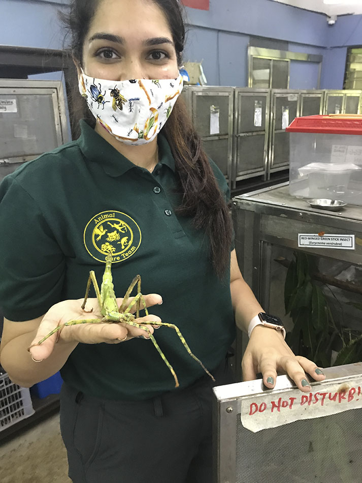 All my life I have seen pictures of leaf insects, broad, flat totally leaf like, large critters that purportedly live in the canopies of deepet darkest jungles. However, myself, and most of my entomologist friends have never seen one, and others say they have, but then show me pictures of babies, which do not ‘yet’ have the leaf shape. So I have been convinced that the images of the impossibly amazing adults, are of plastic toys. That is until I had the great pleasure and privilidge to go behind the scenes at the Insect Zoo in Singapore. The Insect wrangler/keeper, the very lucky and knowledgeable Delvinder Kaur, was my guide.