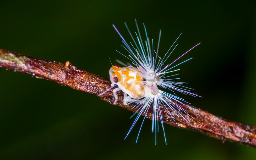 Back to nice innocent six legs, (cowering under the hooves of the running bulls-in-china-shop). Nothing can be added to the pic below. Its just plain weird and gorgeous in the best sense. A baby plant hopper playing games with the wax sticks emanating from its little bum.