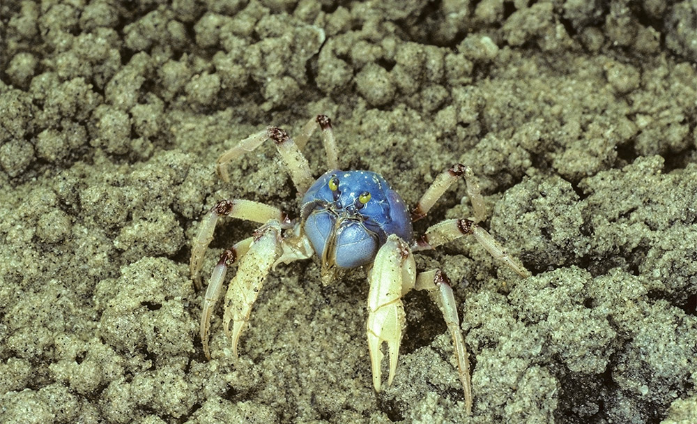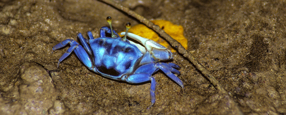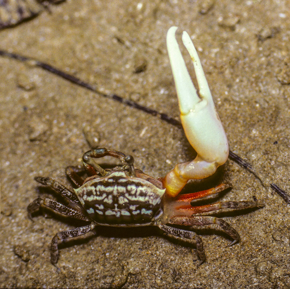 The majority of crabs you see running around are in the normal normal crab family, the Ocypodidae. In the mangroves, this does however include the less normal, but common, fiddler crabs. The males have one huge claw and one tiny. The big colourful one gets waved about to attract females, and is used in combat with other boys.