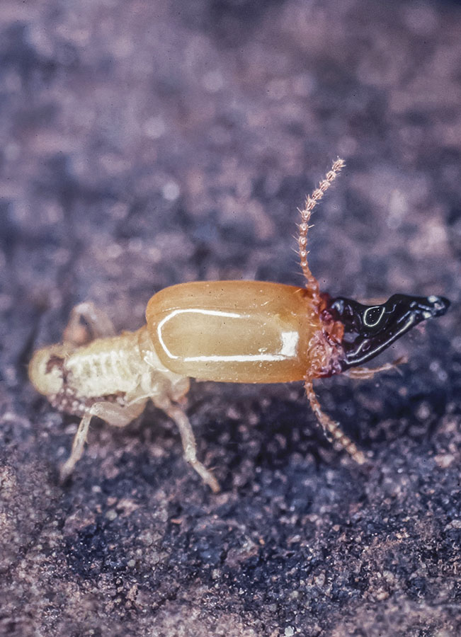 These guys are carrying moss, a much more nutricious food than dry wood. But like most termites, their guts have a riot of micro critters from protozoans, spirochetes and bacteria, that can break down all the super hard bits of plants, like cellulose and lignin. Note the dude, a soldier, in the upper right corner, whose head has a cute pointy bit. This is a species in the ‘nasute’ group, with this pointy siphon structure which shoots out a glue to immobilise and hassle attackers, especially the mortal enemies, the murderous ants. The soldiers guard the trails and the nest entrances, and do not carry food bits like the obedient regimented workers. Below a few other types of soldiers…