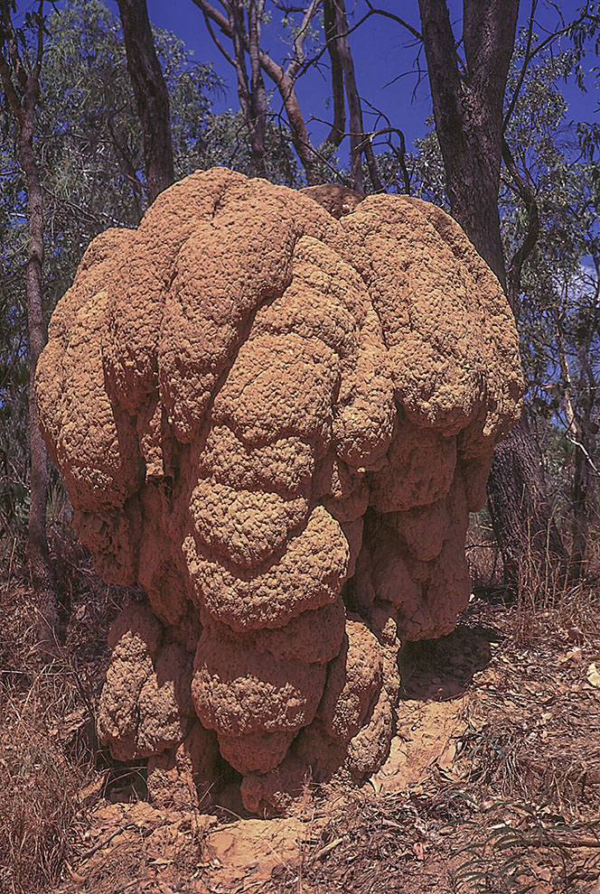 Above a typical nest of Nasutitermes species in Cape York Peninsula, often up to 5 metres high. In Africa similar nests can reach 9-10 metres ! On the left is the ‘elefant bum’ type of nest, oddly made by the same species that builds the spires. Below are the very clever houses of the magnetic termites. All these flat nests are oriented the same way, roughly north-south, to minimise the midday sun’s heat, yet warm the nest for morning activity.