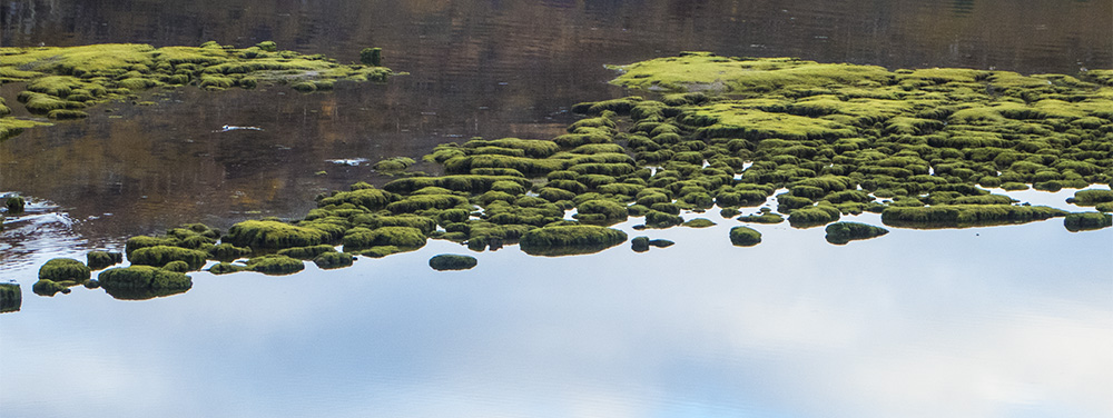 and to another, not hilly, phenomenon in Scotland. Coastlines of sea lochs sometimes have these very super green little islets of peat, with grass that can handle a LOT of salt, with a pattern that shows its progress towards the sea.