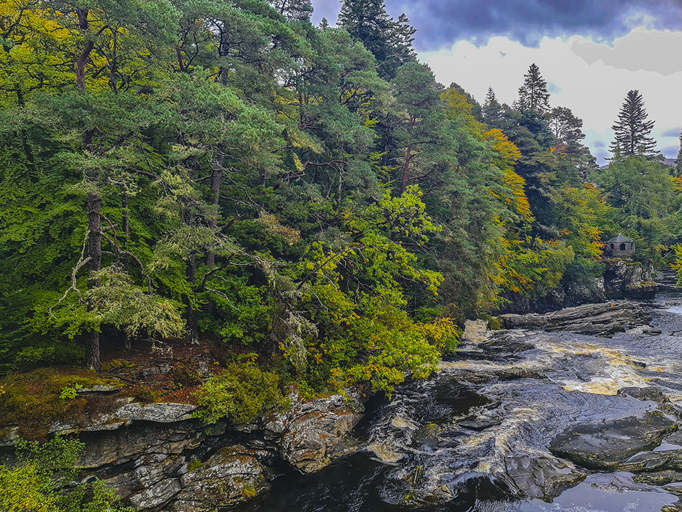 There is a waterfall near Ullapool, where I is, which lives in a fabulous very narrow canyon, possibly a geological fault line as well as water action. Note the eeeny weeny bridge for scale.