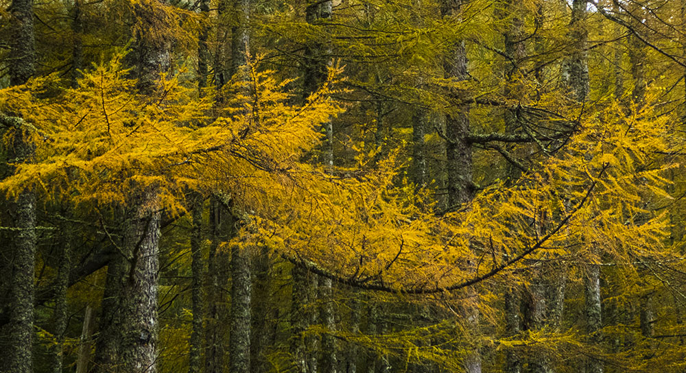 Sunny afternoons are rare and portend great scenes with the horizontal light. Those very sweet larch trees were at it again. First a forest, and second, one individual choosing to show a zen bush-stroke