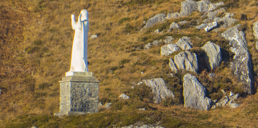 Note on the big scene, a little white blob on the left that looks like a wee lighthouse. It is actually a giant statue of Mother Mary, put there by a Lord somebody, who wanted to show that there be proper god fearing catholics in the area. He wanted marble, which proved too heavy to bring, so it is made from boat grade fibrglass – LOTS of it.
