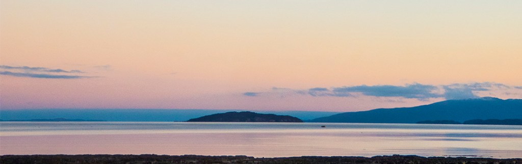 I have had two sunny sunrises since getting to Skye. The scene outside my cottage captures the subtlety of these events. The first had very soft pastels of mainly blues, foggy bits hiding the islands behind. The second was more dramatic, with a great deep blue receding cloud-bank in the background…