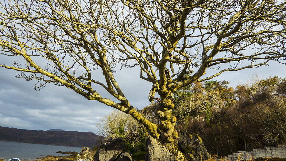 Leaving Skye today. Just a little note about my friends the trees. On one little coastal bit are trees that have ages ago been ‘coppiced’ Chopped back over and over to get more wood from them without actually killing the tree. It results in very tortured groobly trunks like so