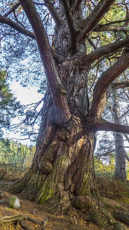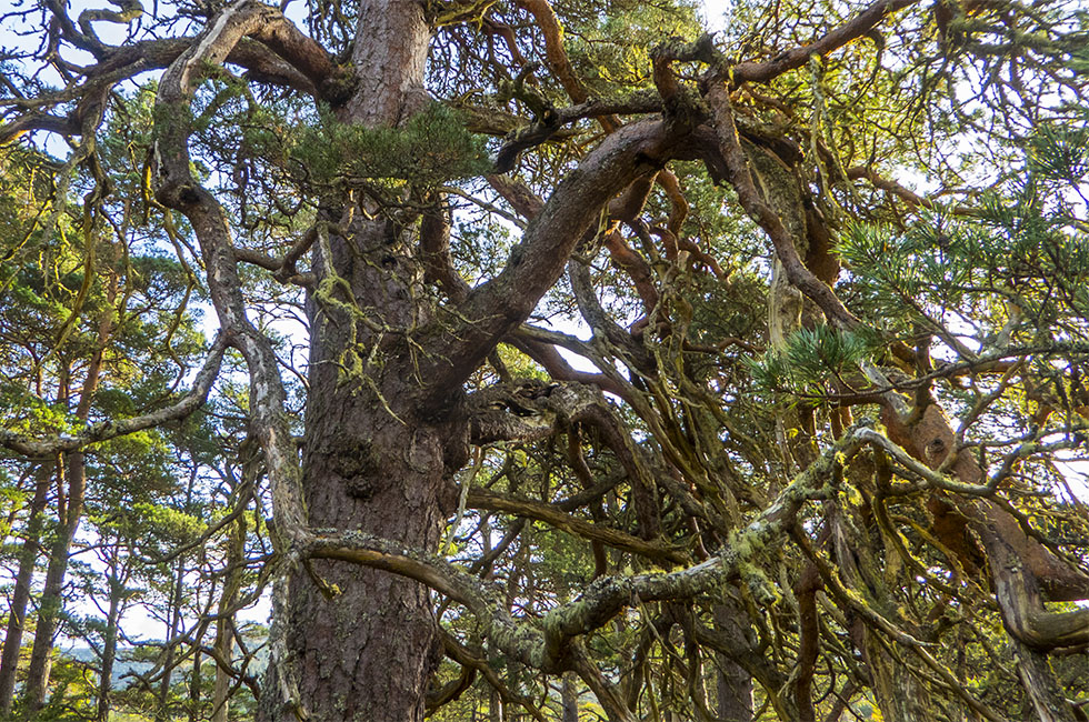 These forests are a mix of larch, birch, beech and other fun European tree names. But in this area also hide patches of the OLD Caledonian forest, with the dominant tree being the Caledonan pine, Pinus sylvestris. A slow growing, narly, not straight, building timber ready, Pinus radiata. Here around several lochs are the largest stands left of the 1% cover they have today compared to the prehistoric times, when they covered at least half of northern Scotland. See the playful way the few original old girls (probably about 400 years old) grow their branches and fat trunks.