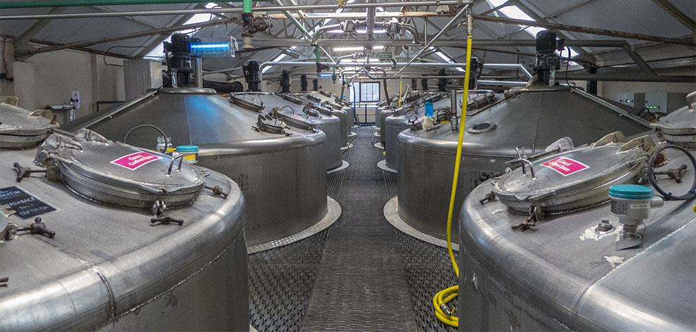 …when the steamy mix leaves the building – top left – it gets passed through the cold condenser – seen on the ground here, and turned back to liquid and put into more vats to do it again. But below is where the magic happens. Anywhere from 3 to 50 years of flavour infusing from the barrels. As they age the whiskey evaporates through the wood – its called the ‘angel’s share’ – so that the older barrels have less liquid to bottle. (the aroma in the ageing shed is amazing). See next to me is one barrel with 1975 on it – 50 years old. A 50 year old vintage was released last year. Only 100 of the 500 litres was left in the barrel, so only 120 bottles exist, at a cost of a mere 18,000 punds each.